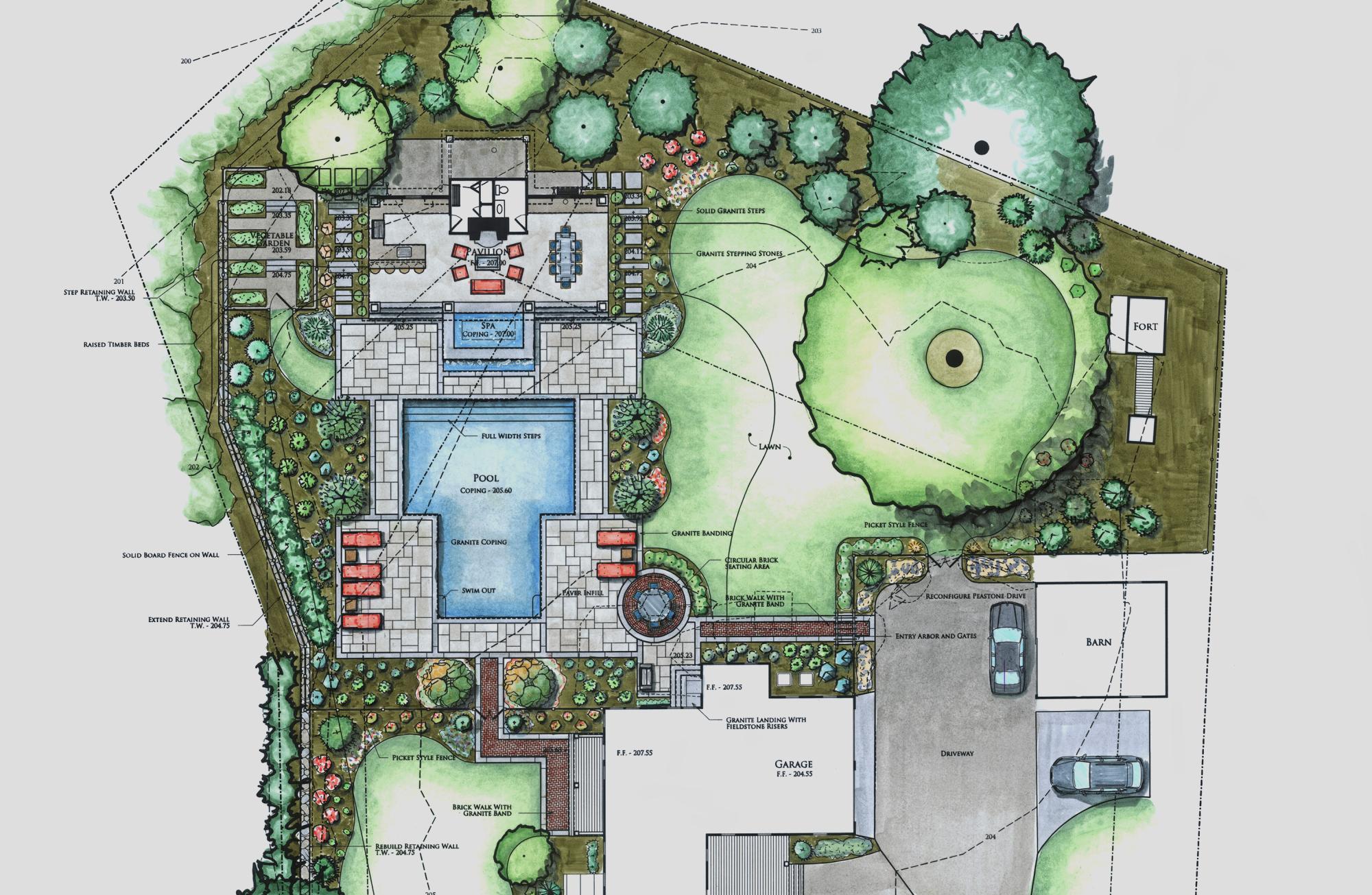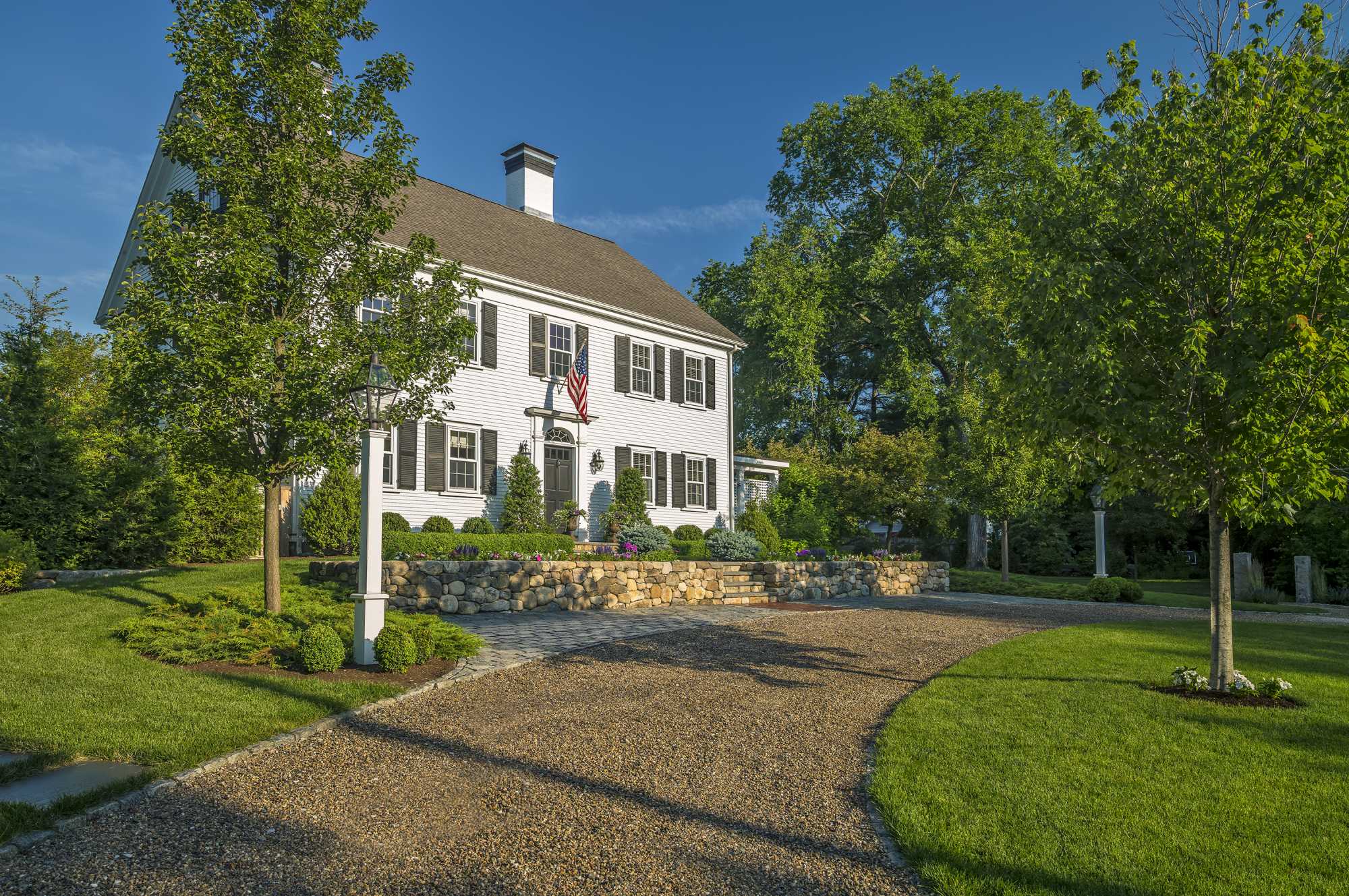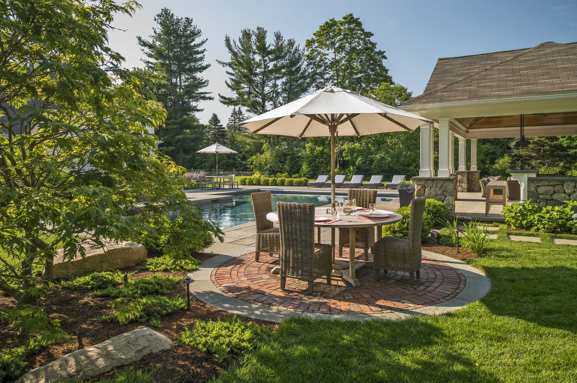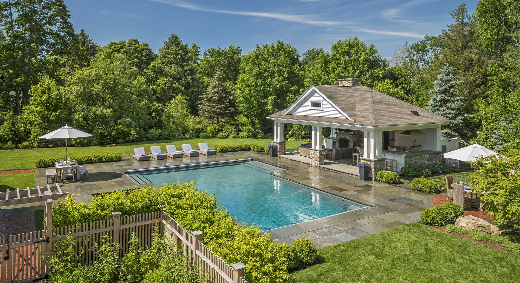 The property of this historical home went through a full site transformation over the course of multiple projects. The front yard was restored to its traditional character through the use of natural stone walls, antique brick walks and a peastone drive. The rear yard evolved into a dynamic entertaining area for a young and active family while incorporating a common palette of materials and timeless styles. The addition of an oversized pool, spa, and open air pavilion, which houses a fireplace and full outdoor kitchen, provide outdoor living for multiple seasons.
